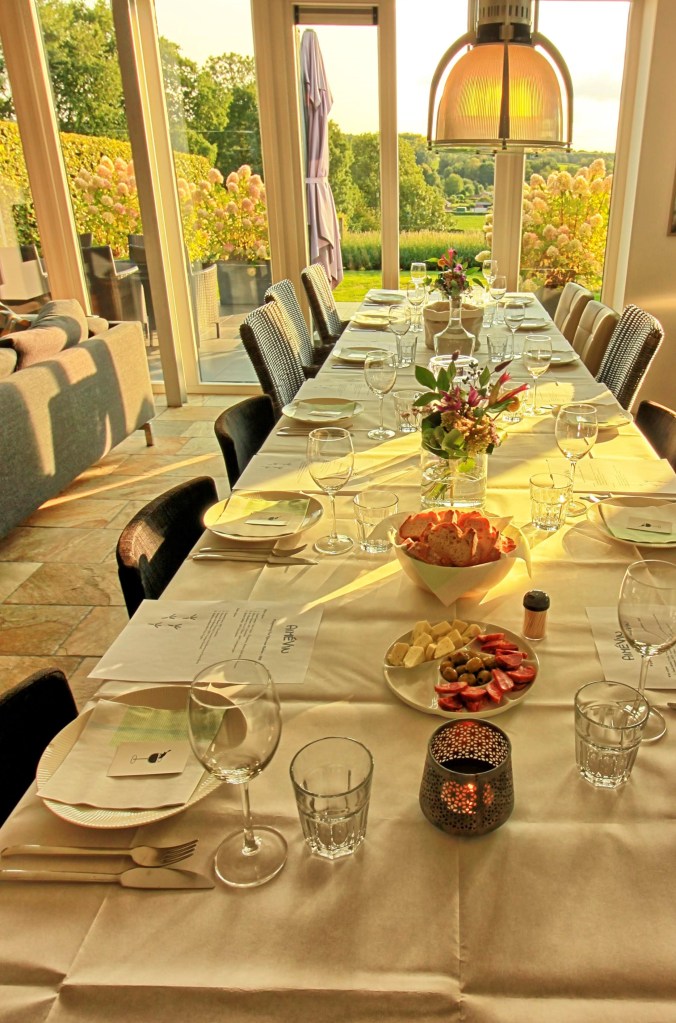 Geen straf om met mooi, zonnig weer van Maastricht naar Vijlen te rijden. Het landschap is heuvelachtig en schitterend groen. Het huis van Bas en Janine heeft ook een prachtig uitzicht; in de verte zie je de wijngaarden van Sint Martinus liggen. Een witte wijn van deze bekende wijnmaker heb ik dan ook opgenomen in mijn proeverij.