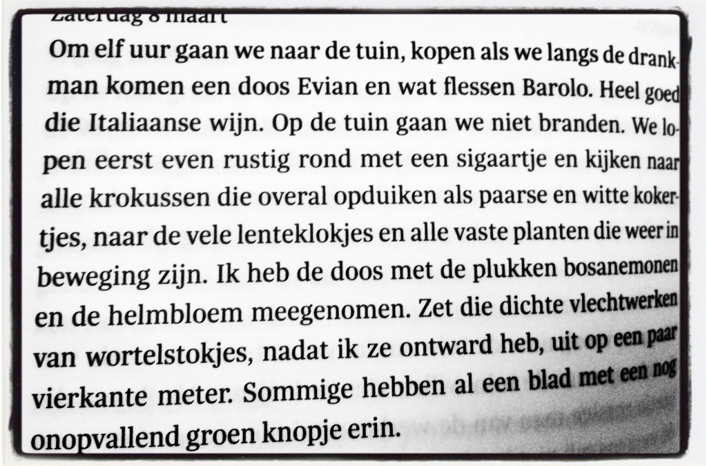 Maart: Ontwaakt! Bijna lente. De witte deken is weg en de natuur ontwaakt. Ik voel de onrust kriebelen en zaai thuis alvast wat voor in potten: aubergines, tomaten, courgettes, radijsjes en bonen. Ondertussen verdiep ik me in de moestuinromantiek van Jan Wolkers in zijn boek Amstelglorie.