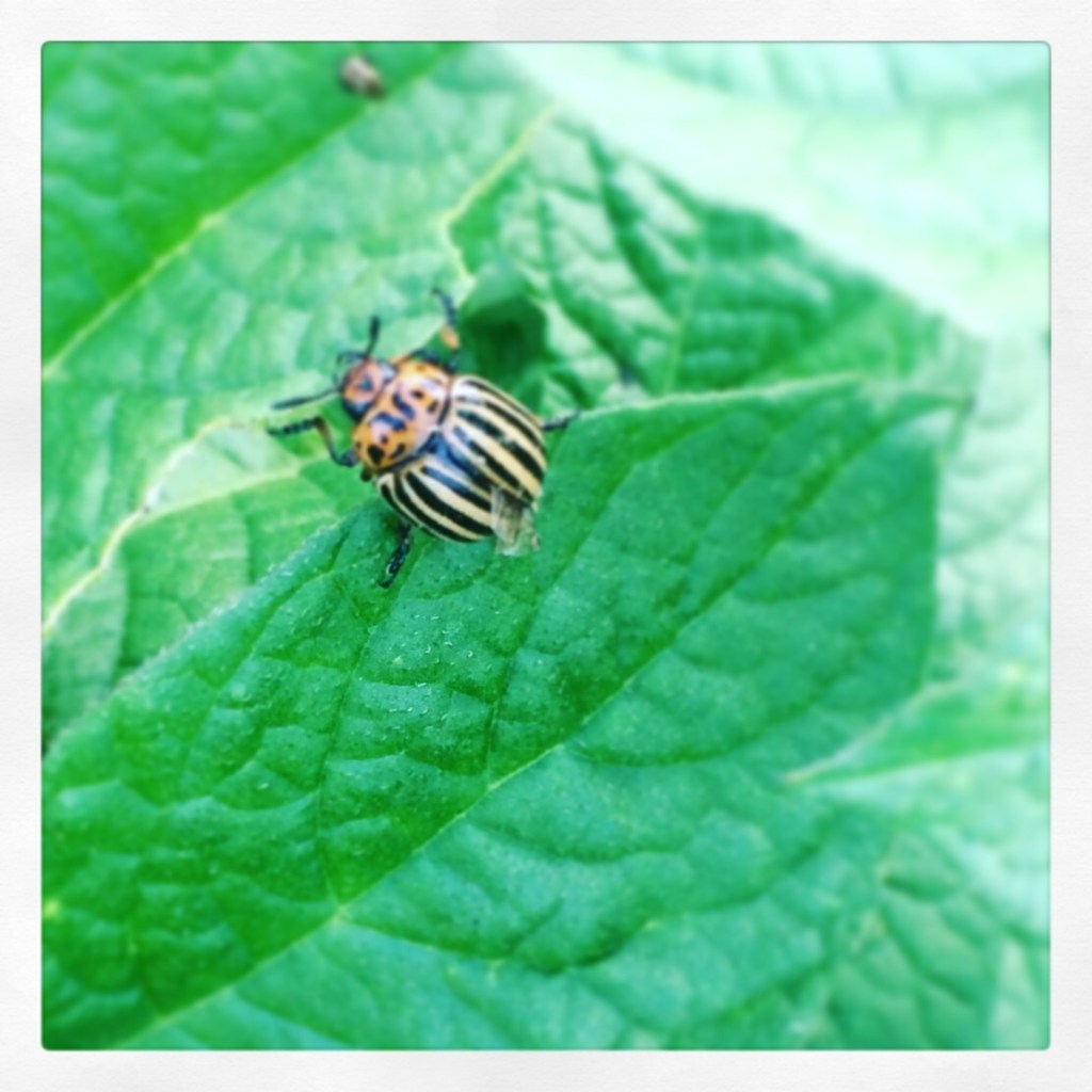 Juli. Het is nu volop zomer. De beruchte Coloradokever is gesignaleerd in de tuinen. Deze kever houdt heel erg van aardappels, en vooral van mijn aardappelplanten. Wat te doen? Een andere moestuinier geeft me een bekertje met een mengsel van spiritus en water. Daarin kan ik ze verdrinken. Zo verklaar ik de oorlog aan het geel-zwart gestreepte, hongerige kevertje. Helaas is hij niet onder de indruk van mijn spiritusoffensief. Een week later zijn alsnog alle planten aangetast.