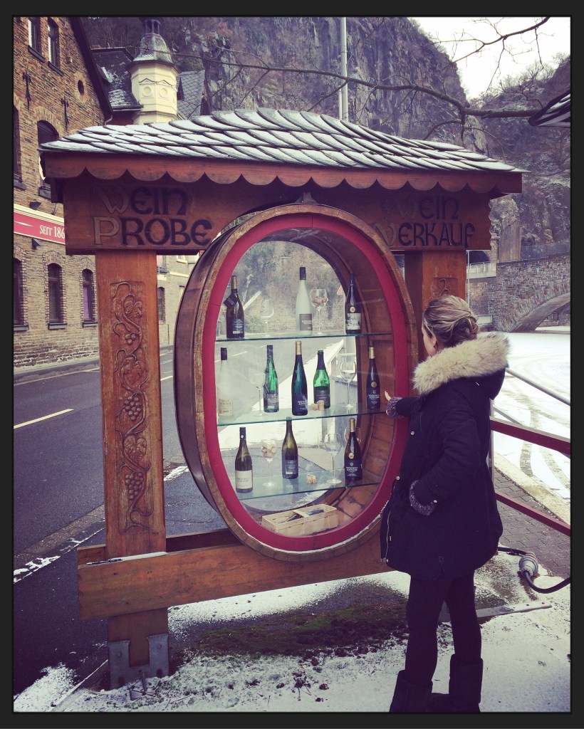 De omgeving is bedekt onder een lichte, transparante witte sluier, alsof het zojuist heeft gesneeuwd. Het is stil op straat. We parkeren voor een gebouw met in hoofdletters op de gevel: Winzergenossenschaft Mayschoss-Altenahr. In de vinotheek is het rustig en sfeervol. De verkoper vertelt me dat het in het hoogseizoen “der Teufel los ist” (erg druk) is. Nu slaapt de duivel. Nadat we wat aankopen hebben gedaan, rijden we door naar het dorpje Mayschoss, waar de oude wijnmakerij ligt. Onderweg zijn de steile hellingen en terrassen al goed te zien, en ik vraag me af hoe de druiven hier geplukt worden.