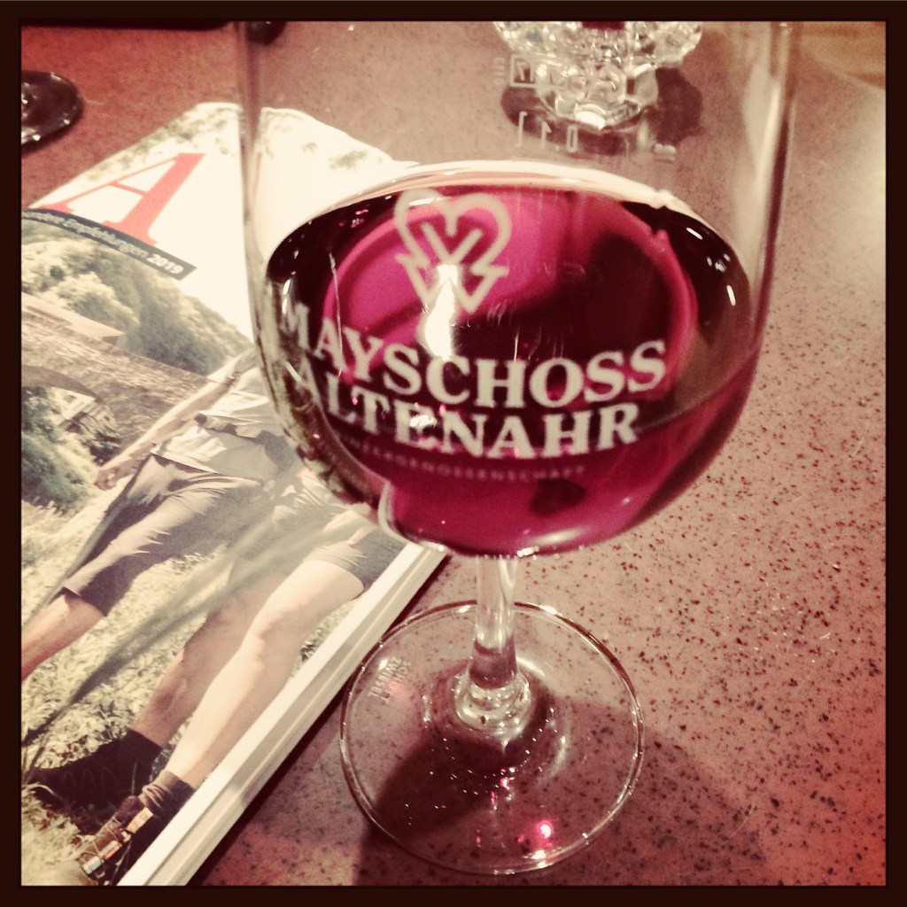 Eenmaal binnen bij de firma Mayschoss krijgen we een rondleiding door de wijnkelder, waar ook het knusse wijnbouwmuseum is gevestigd. Na de tour laat de gids ons nog drie wijnen proeven. In de wijnshop snuffel ik wat rond en koop een flesje Frühburgunder, een vroeg rijpende mutatie van de pinot noir en typisch voor deze regio. Twee druivenrassen zijn hier belangrijk: de Spätburgunder (pinot noir) voor rode wijn en de Riesling voor witte wijn.