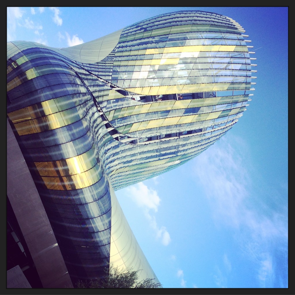 Van het goud van D’Yquem gaan we naar het zilver (met een vleugje goud) van de Cité du Vin. Onze tour eindigt in een metalen reuzenkelk die het zonlicht en het water op geraffineerde wijze weerkaatst. De Cité du Vin is gevestigd in deze wervelende sculptuur die sinds 2016 schittert aan de oever van de Gironde. Binnenin het futuristisch vormgegeven gebouw zijn ruimtes waarin een bibliotheek, winkel en exporuimte te bezoeken zijn. Alles draait, als het ware, om wijn, wijn, wijn.