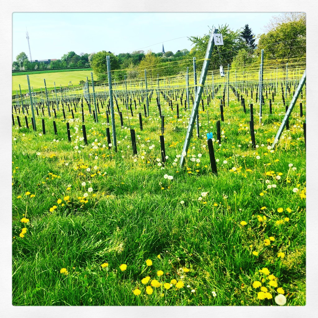 Koningsdag 2020. Ik loop op een kiezelige landweg in een bronsgroen Limburgs landschap. Ik houd halt bij een metalen poort met een logo van een zwart wapenschild. Het is de plek waar ik deze ochtend afgesproken heb met één van de vier eigenaren van het op vier mei 2019 opgerichte Wijndomein: Riesenberg. Nu bijna een jaar later open ik de zwarte toegangspoort van het wijndomein. In de verte bovenaan de wijngaard zie ik iemand met een bosmaaier tussen de druivenstokken hard aan het werk.