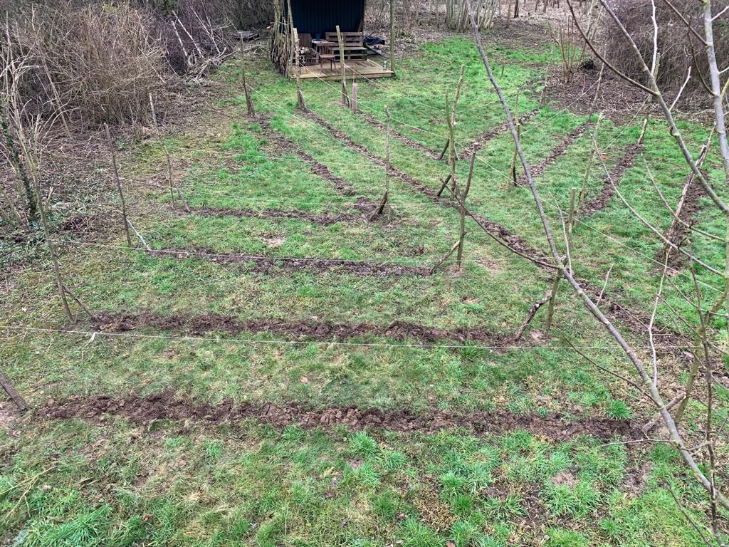 In oktober spannen we draden tussen bamboestokken, waarmee de contouren van de wijngaard zichtbaar worden. De opzet volgt de nerven van een blad. Een grappig detail: precies door de kleine wijngaard loopt een dassenpad, te herkennen aan het platgetrapte gras. We vragen ons af of dit volgend jaar nog steeds zo leuk is…
