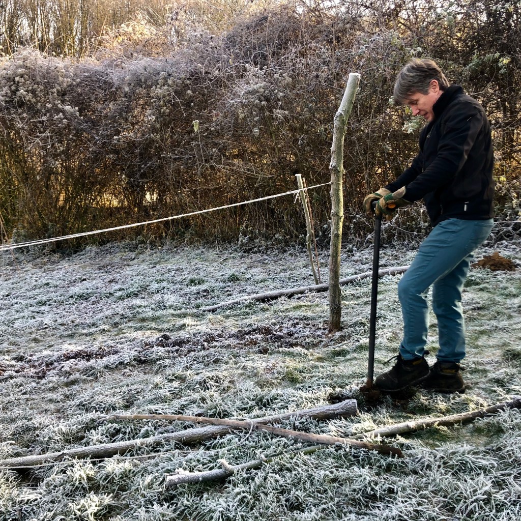 Begin december. Terug naar de wijngaard. Voordat het gaat vriezen gaan we handmatig gaten boren om palen te plaatsen voor de steunpalen van de wijngaard. We gebruik hiervoor acaciahout dat overvloedig groeit op het stukje land. Zo recyclen we het snelgroeiende hout.