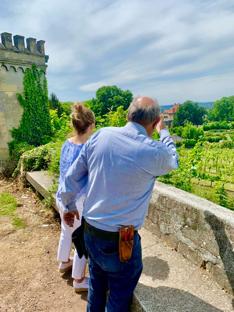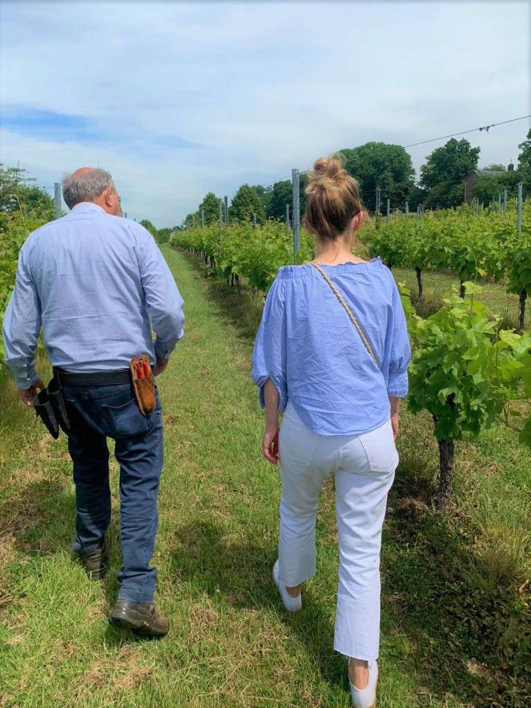 We parkeren bij wijnwinkel Sauter en wandelen de wijngaard in voor een afspraak met Jean Muytjens, de keldermeester van Domaine Backerbosch. Jean laat me meteen het werk in de wijngaard zien.