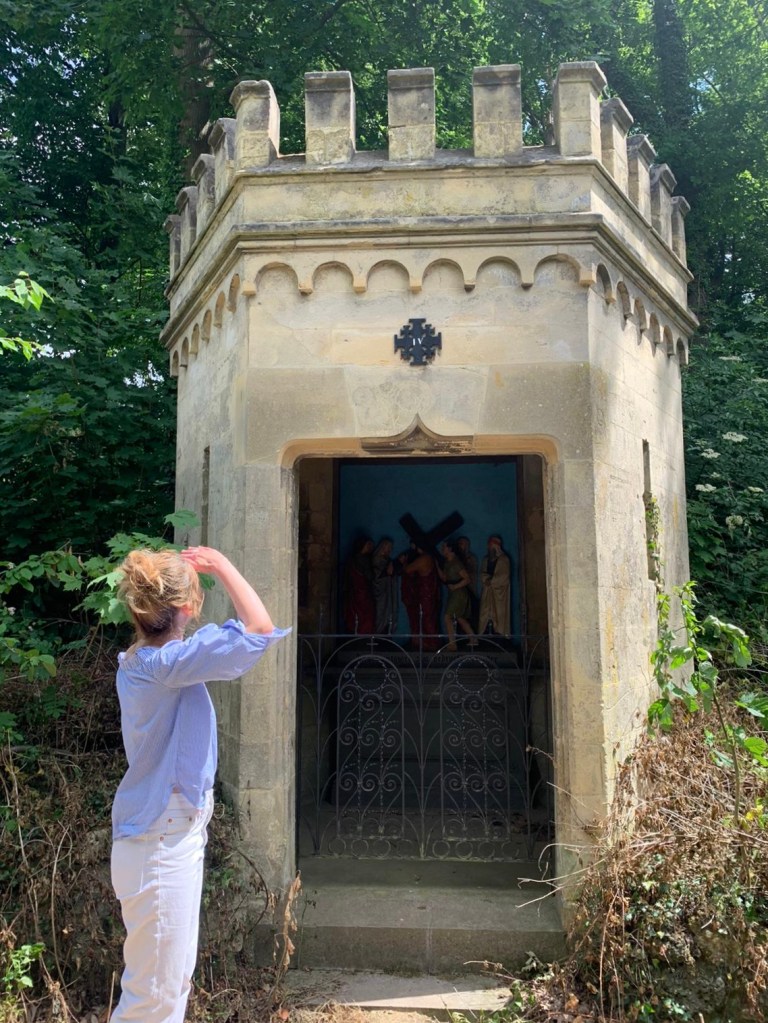 We lopen via een pad omhoog naar de top van de heuvel. Vanaf hier hebben we een fantastisch uitzicht over het Maasdal. Op deze heuvel staan twaalf mergelkapelletjes die samen een kruisgang vormen. De kapellen en het naastgelegen landgoed met klooster staan onder monumentenzorg.