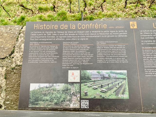 Paul vervolgt zijn verhaal: “Er ontstond een netwerk van 150 abdijen door heel Europa. Citeaux stichtte dochterabdijen, en Clairvaux stichtte deze abdij, waardoor we eigenlijk een kleindochter van Citeaux zijn. Dit netwerk strekte zich uit tot aan de Mittelrhein in Duitsland, waar het beroemde Kloster Eberbach (waar ik al eerder een blog over heb geschreven: zie link) is gevestigd. Tienduizenden hectaren werden beplant met wijnstokken, tot diep in Vlaams-Brabant en Antwerpen. Maar toen kwamen de godsdienstoorlogen en was het gedaan met de wijnbouw. Na de Franse Revolutie was er nog een korte bloei, maar daarna viel alles stil. Aan het einde van de achttiende eeuw was de abdij verlaten en lag de wijngaard er als een ruïne bij.”