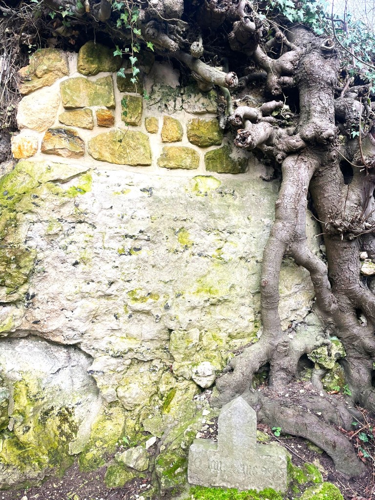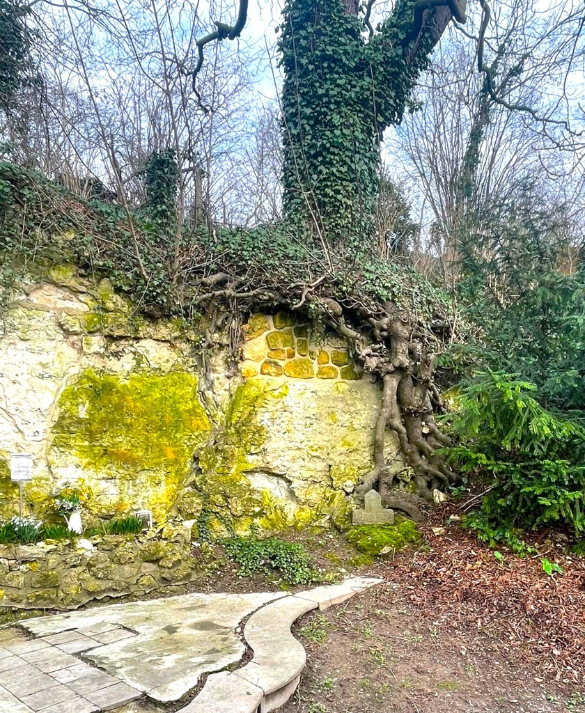 We staan inmiddels weer beneden aan de heuvel voor de kleine kalkgroeve met in de nis een mariabeeld. Peter:’’ Hier zie je een dwarsdoorsnede van de wijngaard. Je ziet in dit geval geen wortels van druiven maar wel de wortels van de kastanjeboom. Dit illustreert hoe de druivenstok zijn voeding peurt uit de kalkstenenbodem. Er zitten hier de wezenlijke bestanddelen die de smaak vormen voor het uiteindelijke product. Het zijn niet alleen de zuren maar ook de fijne bitterstoffen, in die hele compositie, die de diepgang aan de wijn geeft. Ik noem dat zelf het ‘’Bach-effect’’. Dat komt door de natuur te respecteren”.