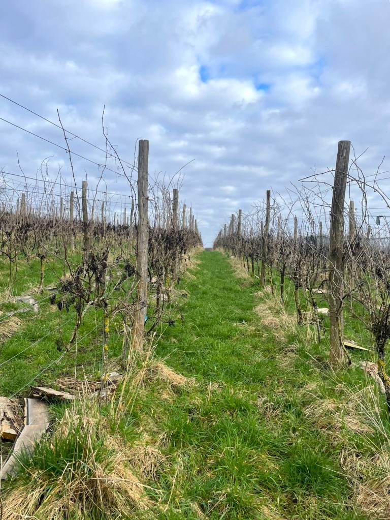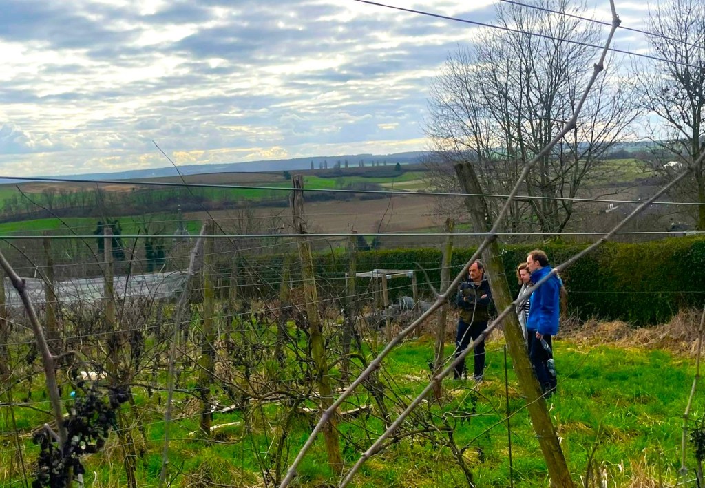 We komen aan bij de wijngaard boven op de heuvel. Hoe zijn jullie hier zelf terecht gekomen? Peter:’’Ik ben begonnen als boer met het idee, de mogelijkheid om iets op te slaan om het daarna te kunnen vermarkten. Dan kom je heel snel in de wijnbouw uit. Ik noem het plat gezegd, een van de edele conserven. Het geeft je de mogelijkheid als boer om niet in de uitverkoop te hoeven gaan. We hebben verhoudingsgewijs een kleine wijngaard. Wij hebben zes hectare en per hectare zo’n drieduizend stokken. En we hebben nu zo’n drie hectare in productie”.