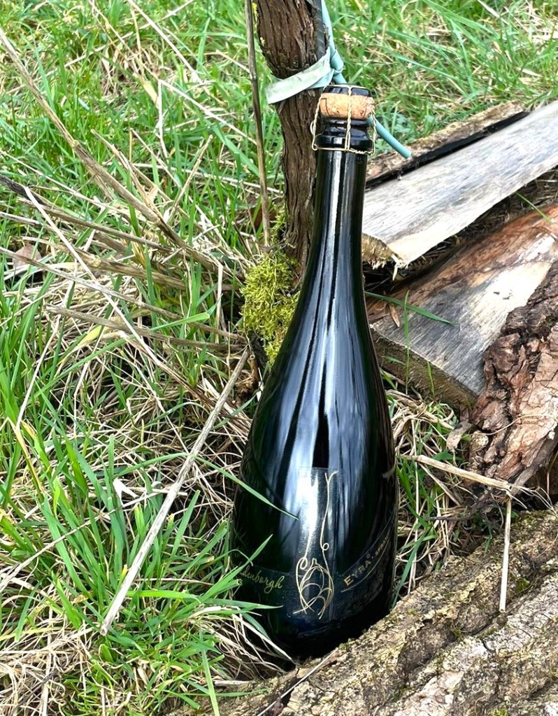 En vanwaar de naam ‘’Eyra’’ voor de mousserende Riesling? Chris:”De naam is van oorsprong Scandinavisch, daar tref je meer Eyra’s aan. Het zijn eigenlijk verhoogde liggingen. Het logo op de fles representeert dit ook. Het is een berg waarop een Burght staat met de wijnrank. Een kunstenaar heeft dit etiket ontworpen, in de stijl van Jugendstil”.